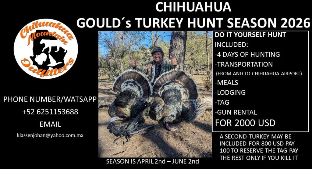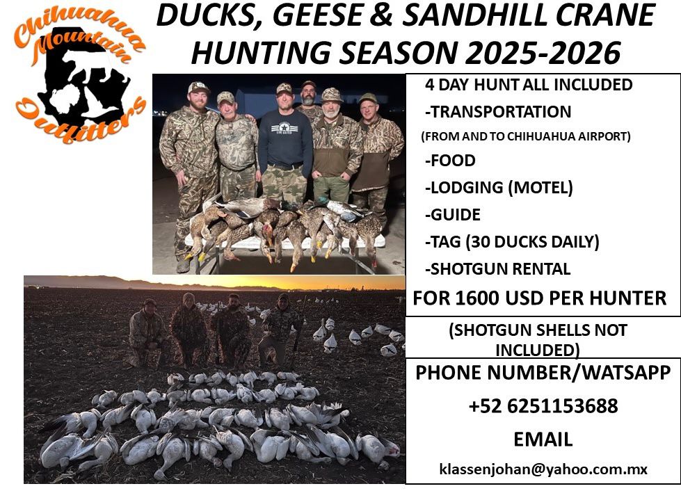 We specialize in Chihuahua state native fauna hunting ( Waterfowl, Gould’s Turkey, Mule Deer, Coues Whitetail deer & exotics) Kids and whole families are welcome